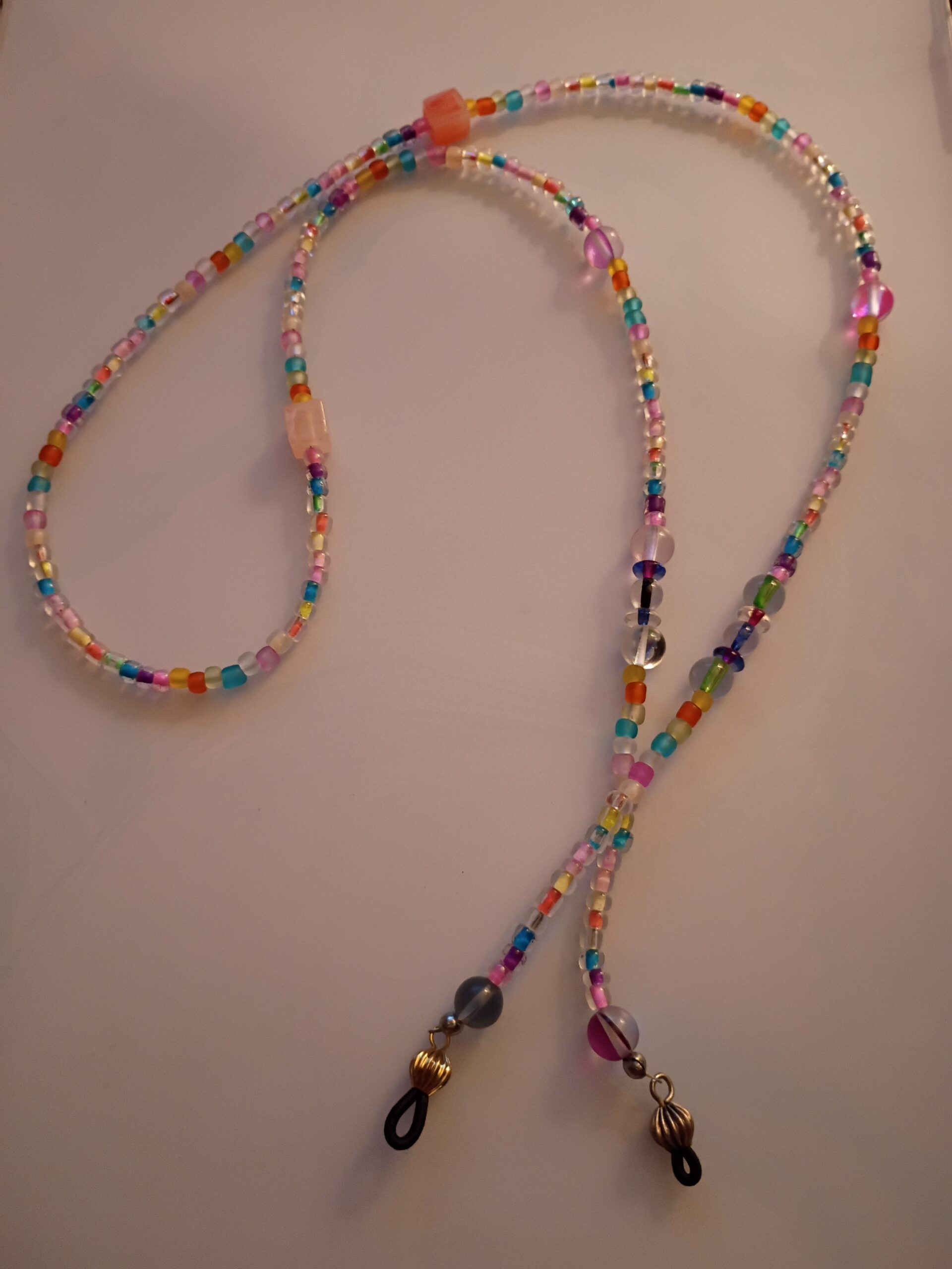 Introducing the captivating Bead Chain – a handmade eyewear accessory that blends style and functionality. Crafted with a vibrant mix of multi-color seed beads, 6mm clear round rainbow glass beads, and shimmering glass cube beads, this chain adds a touch of elegance to any pair of glasses.
