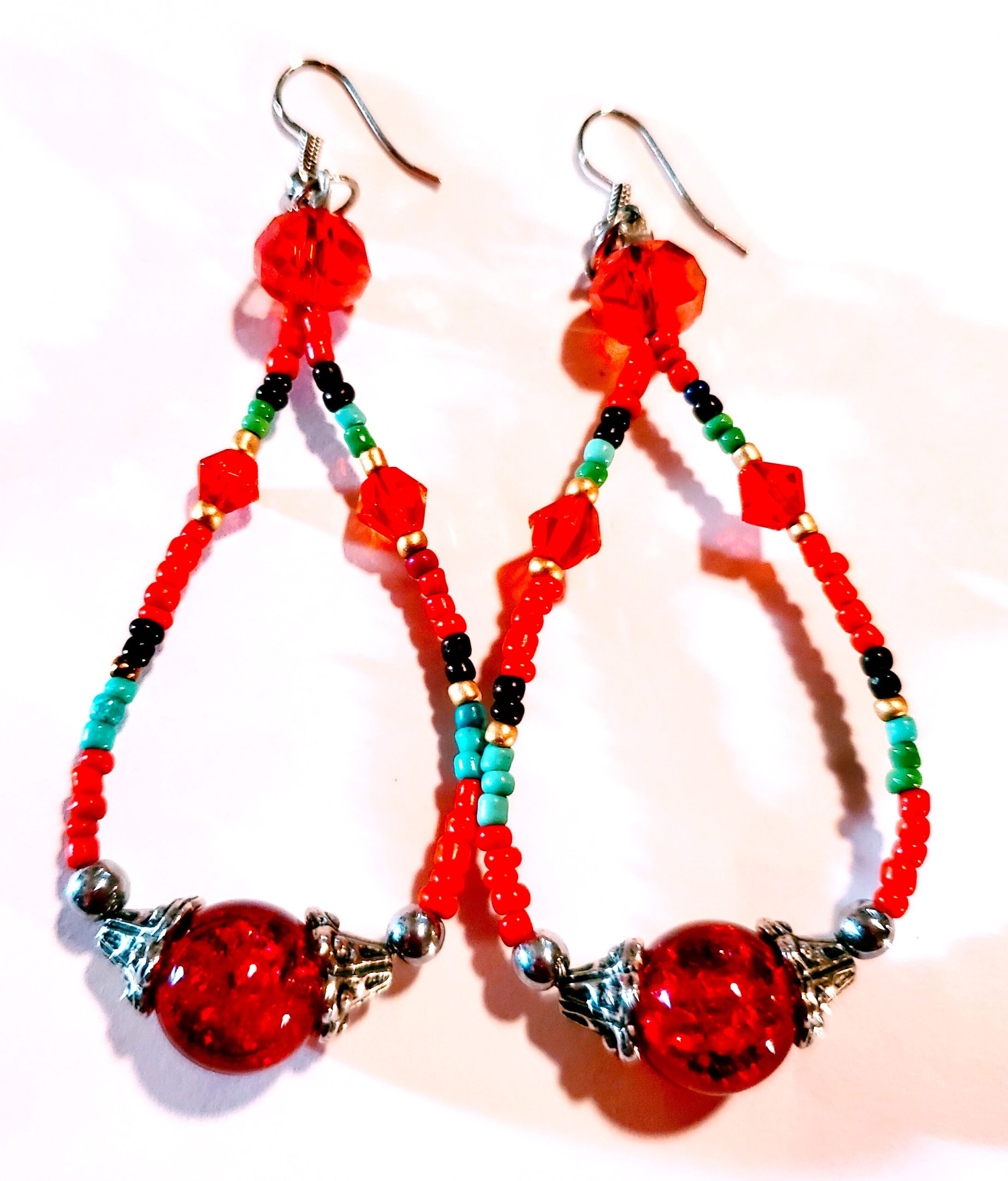 - Vibrant mix of glass seed beads, red Czech glass round, and faceted bicone beads