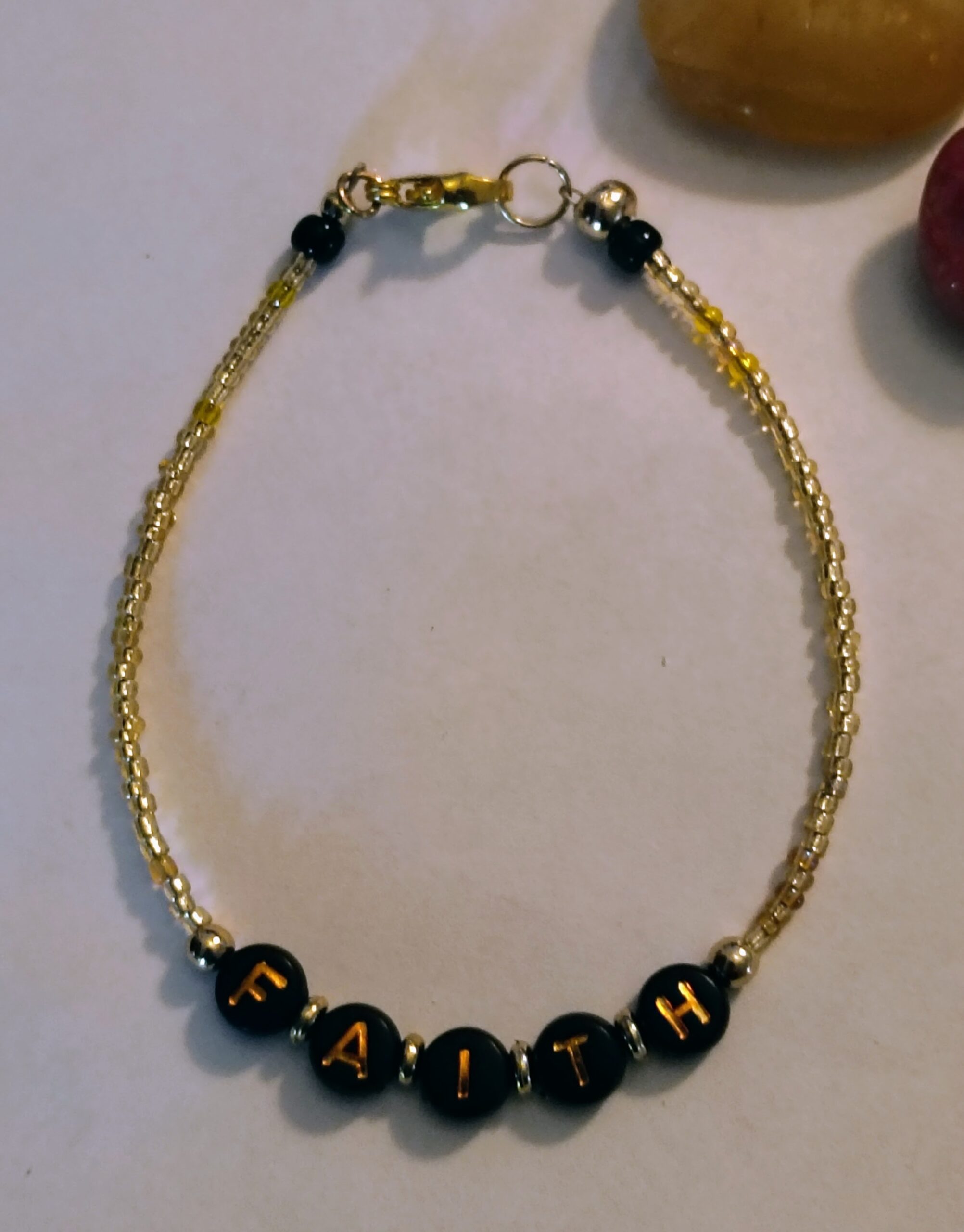 Faith bracelet a perfect way to accessorize your look while also nourishing your soul. This handmade design features shimmering gold beads and inspirational letter beads that serve as a constant reminder of your beliefs.