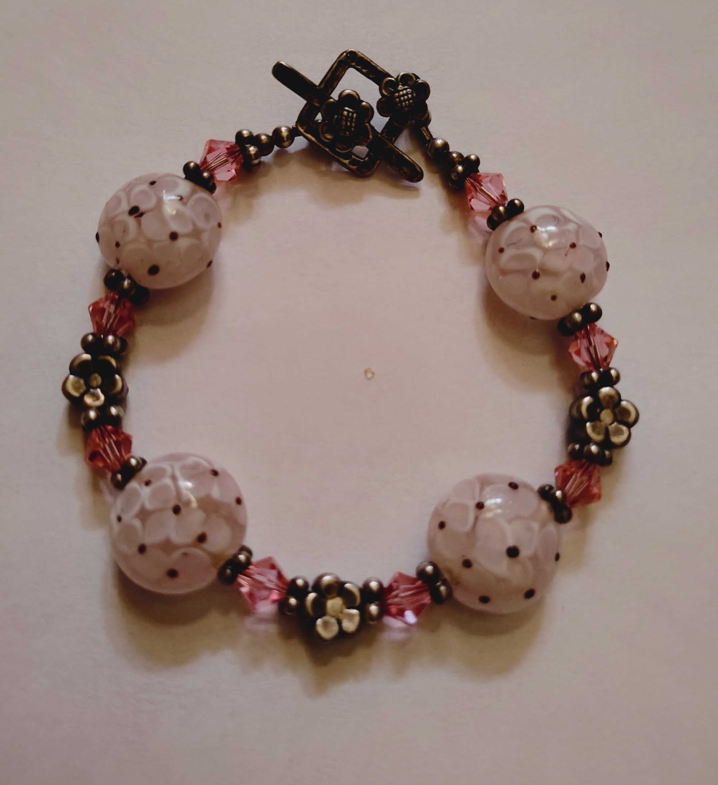 Freckles Bracelet. This handmade beauty blends glass beads, puffed coins, silver flowers, and bicone accents for a dazzling, one-of-a-kind look.