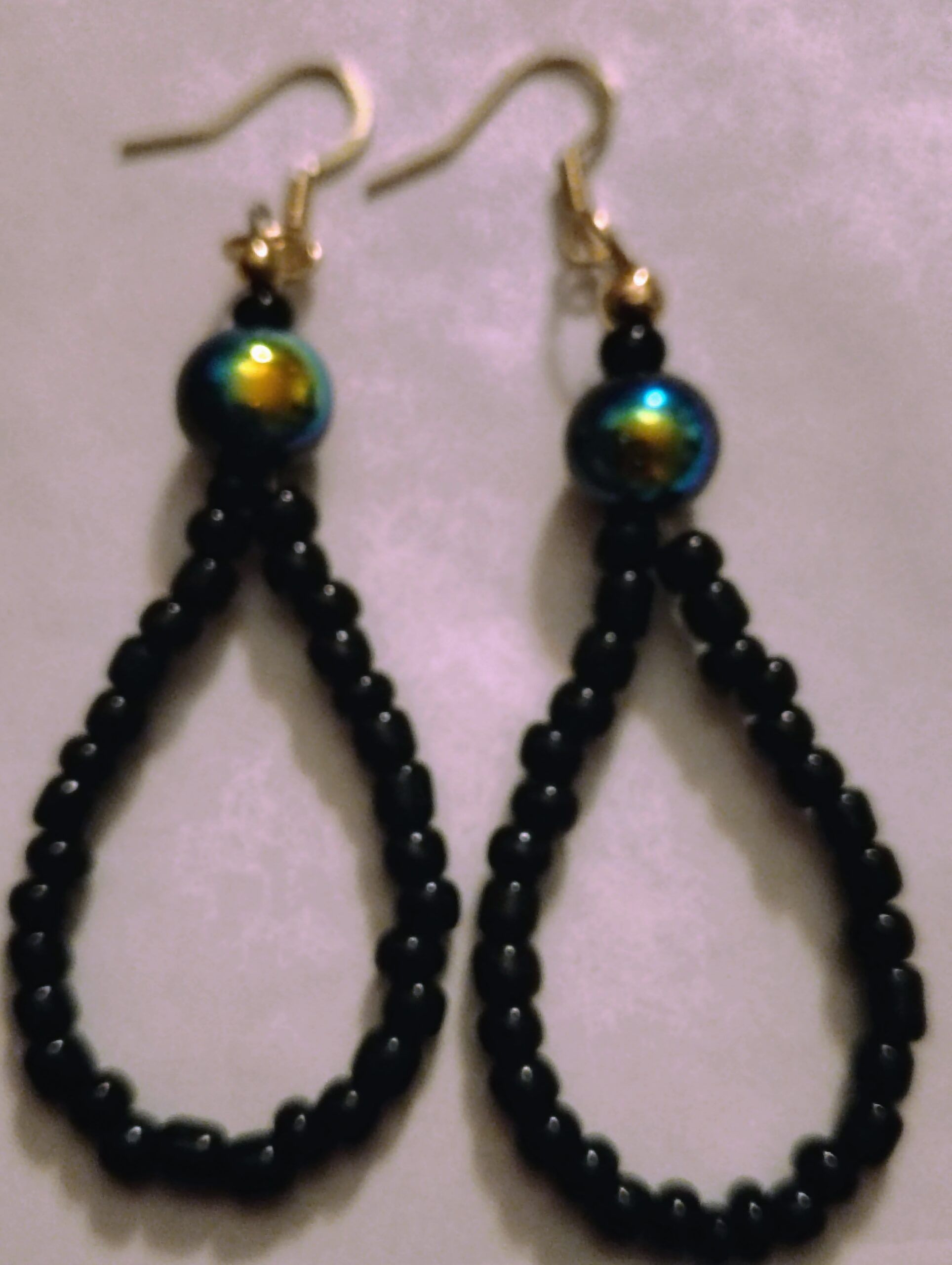 These eye-catching earrings feature a captivating blend of metallic glass beads and black seed beads.