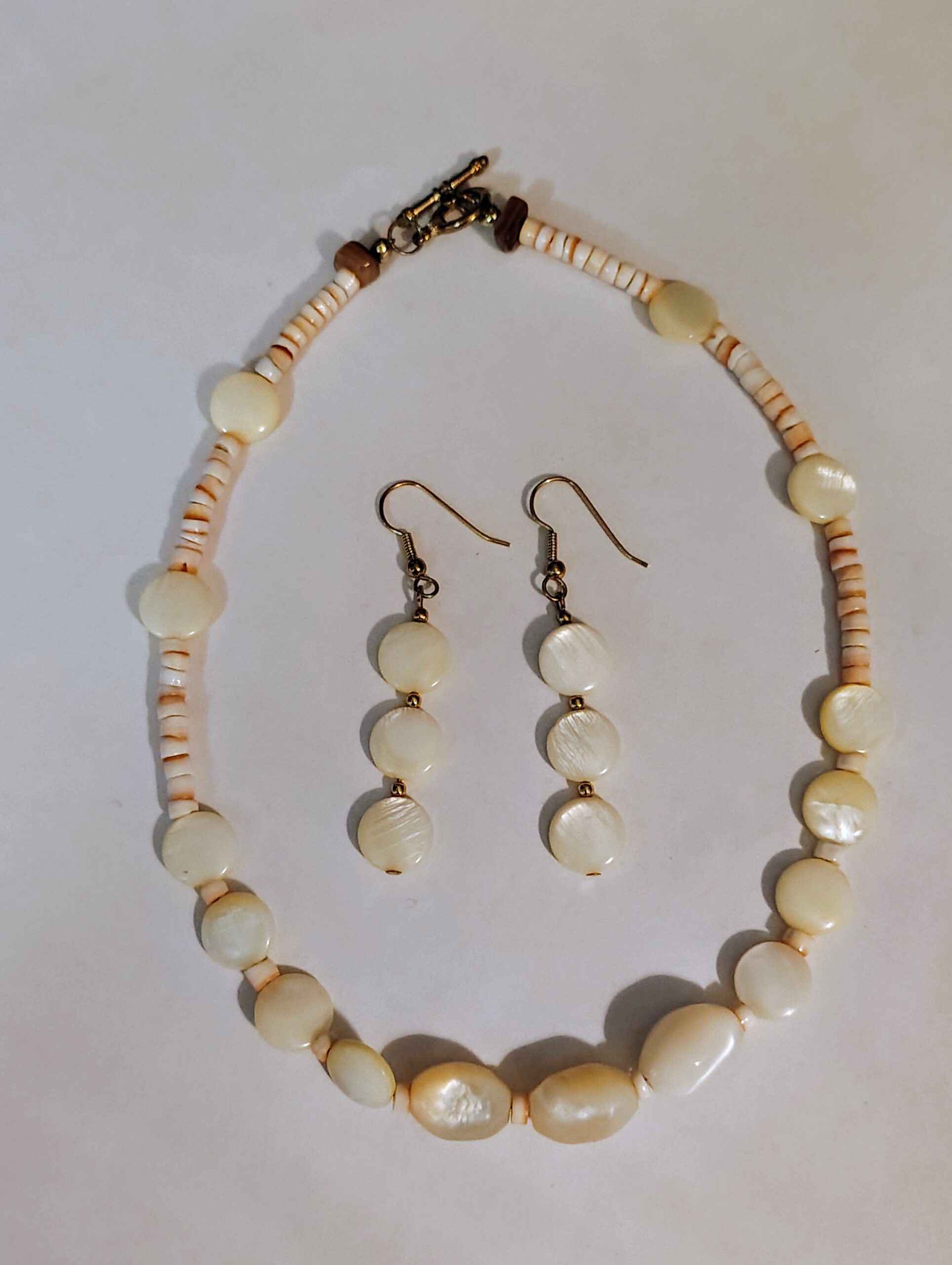 Style with the captivating Mother of Pearl Set. This handmade necklace and earrings duo features: