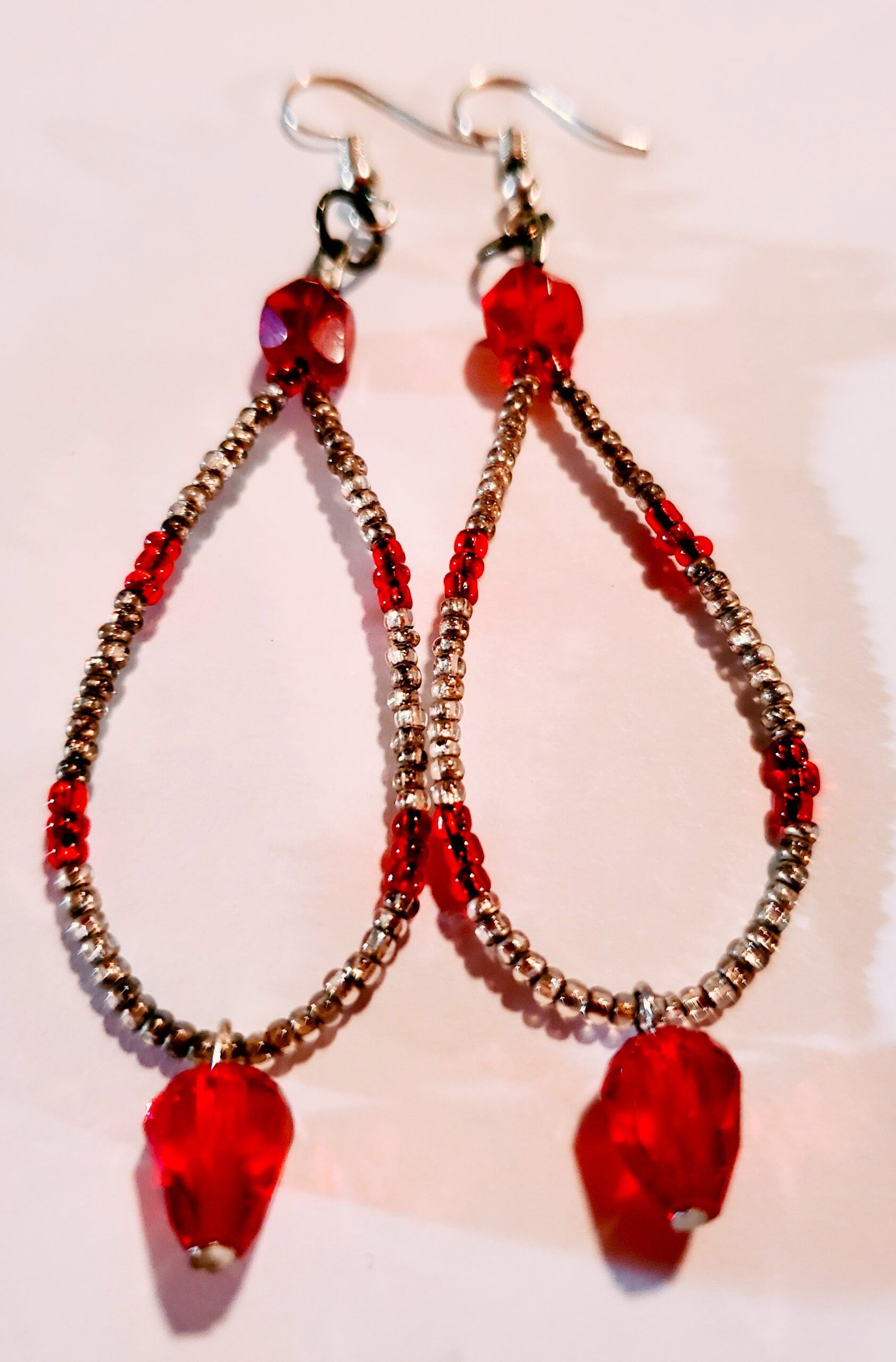 Handcrafted red hoop earrings.