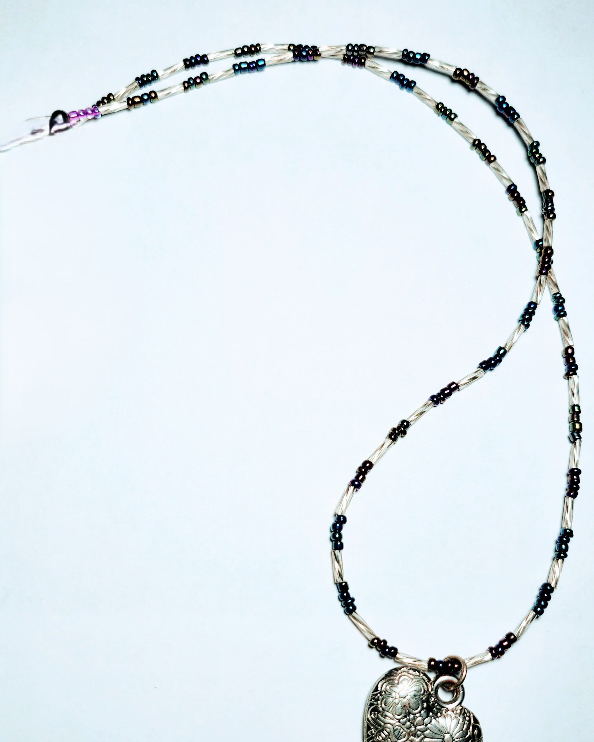 Glass seed beads silver metal heart 24″ length