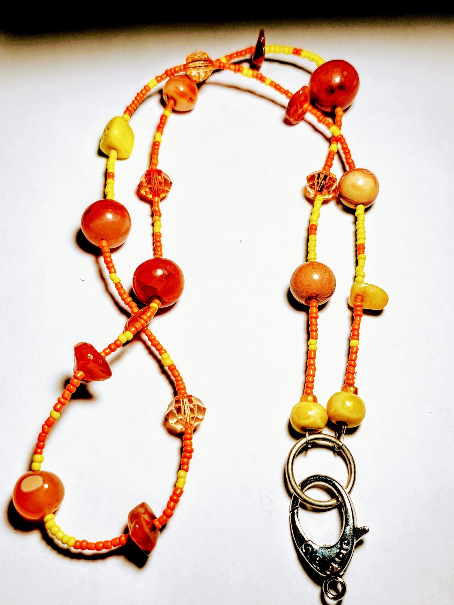Sunshine in a lanyard – the Sunkiss Orange will brighten your day! Handmade with gorgeous glass seed beads and amber accents, this lanyard is a stunning accessory that will elevate any outfit.
