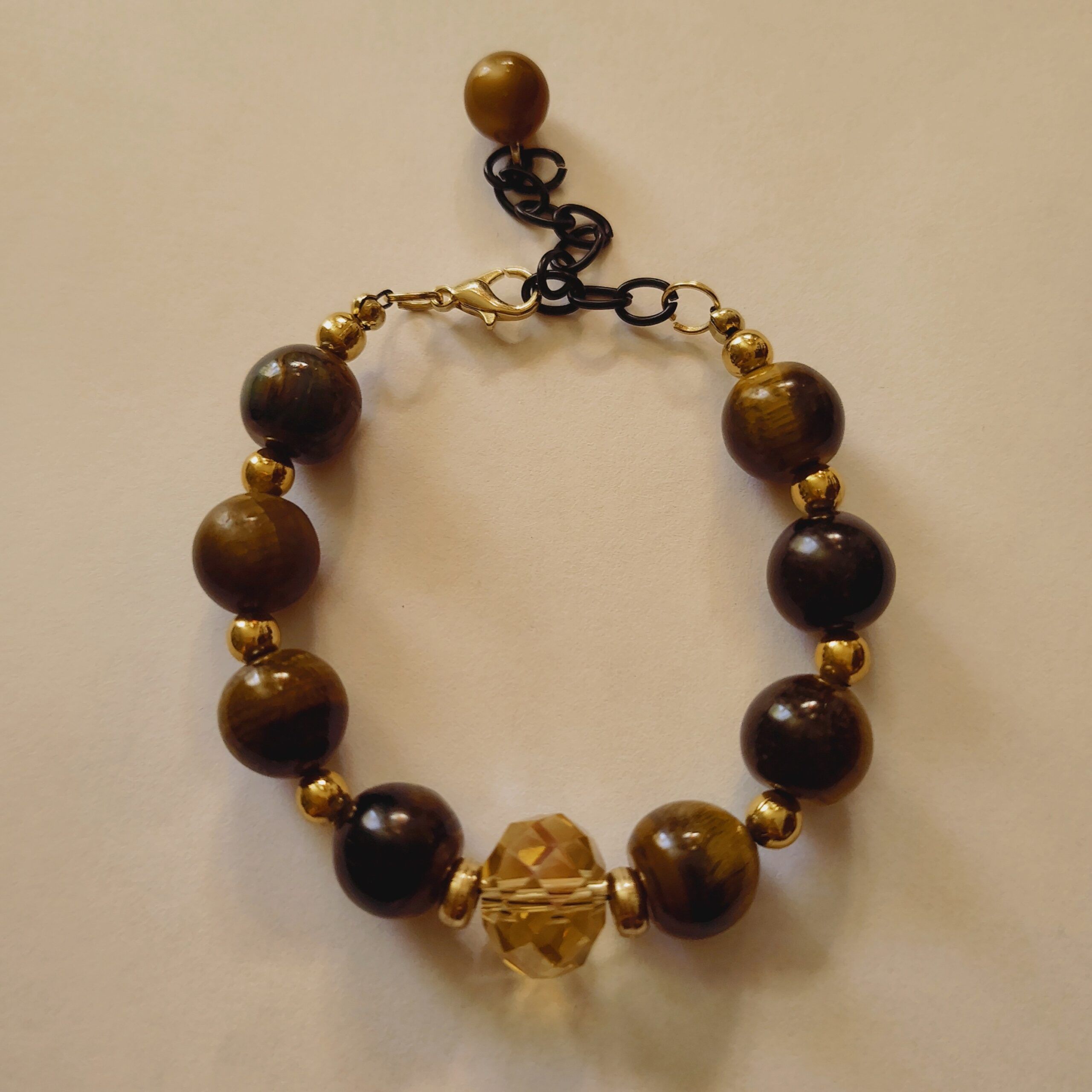 - Features 8.5mm Tigereye gems, 10mm faceted crystal, and 7mm dangling Cat’s Eye bead