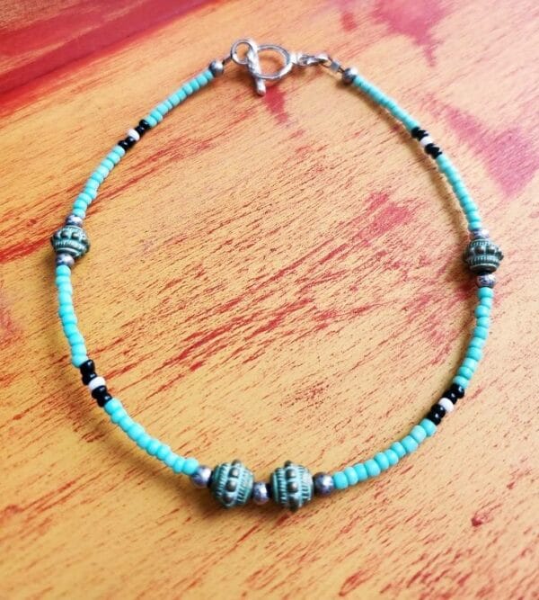 This anklet features a captivating blend of delicate glass beads and shimmering metal accents that come together to create a truly unique and eye-catching piece.